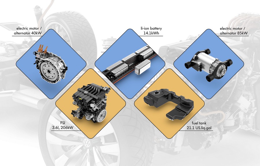 Tryb E (elektryczny). Dzięki baterii litowo-jonowej wbudowanej w tunel środkowy, Cross Coupé GTE może przejechać odległość do 20 mil (32 kilometry) z napędem wyłącznie elektrycznym. W trybie E, włączanym przez kierowcę przyciskiem, o napęd dba tylko silnik elektryczny o mocy 85 kW, zamontowany na tylnej osi. Podczas jazdy z napędem elektrycznym silnik V6 FSI nie pracuje, jest on odłączany od układu napędowego poprzez otwarcie sprzęgła. Gdy poziom naładowania baterii spadnie poniżej określonej wartości lub w grę będą wchodziły inne parametry wymagające dołączenia sześciocylindrowego silnika spalinowego, zostanie on płynnie i w ciągu ułamka sekundy uruchomiony i połączony ponownie z układem napędowym. Za zasilanie silników elektrycznych odpowiedzialna jest bateria litowo-jonowa o pojemności 14,1 kWh. Układ elektroniki mocy, umieszczony w przedniej części komory silnika, zarządza przepływem energii wysokonapięciowej z baterii i do baterii, względnie do silników elektrycznych. Wewnętrzna instalacja elektryczna zasilana jest przez przetwornik DC/DC napięciem 12 V. Bateria ładowana jest z zewnętrznych źródeł energii elektrycznej lub podczas jazdy.