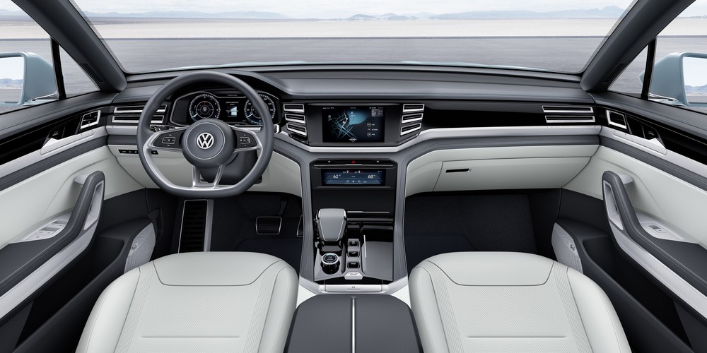 Wizja w żadnym przypadku nie oznacza odejścia od aktualnej stylistyki, lecz jest konsekwentnie udoskonaloną wersją dwóch charakterystycznych cech wnętrza Volkswagenów. Pierwszą cechą jest czysty, poziomy podział architektury wnętrza, szczególnie tablicy rozdzielczej. Drugą cechą charakterystyczną wnętrza każdego Volkswagena jest intuicyjna obsługa i logiczny układ wszystkich elementów i systemów.Pod przednią szybą we wnętrzu studyjnego auta znajduje się poziomy obszar otoczony granatową skórą Nappa. Ciemnoniebieski odcień skóry (Ing Blue) koresponduje z niebieskim lakierem nadwozia (Grand Pacific Glacier). Po bokach skórzana płaszczyzna przechodzi płynnie w dolne obramowanie bocznych okien, pokryte taką samą skórą. Właściwa płaszczyzna Infotainment i obsługowa rozciąga się jak skrzydło przez całą szerokość Cross Coupé GTE. Dominującymi kolorami i materiałami w tej części wnętrza są polerowane aluminium i błyszcząca pleksi w kolorze czarnym Piano, pokryta powłoką odporną na zadrapania. Po bokach znajdują się poziome wloty powietrza wykonane z polerowanego aluminium.